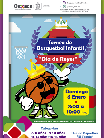 Tlalixtac de Cabrera, Oax. 28 de diciembre de 2018. Para festejar el Día de los Reyes Magos, niñas y niños oaxaqueños disfrutarán del tradicional Torneo de Basquetbol Infantil organizado por la Secretaría de Administración el próximo 6 de enero en la Unidad Deportiva El Tequio demostrando que cuentan con la mejor actitud y talento deportivo.