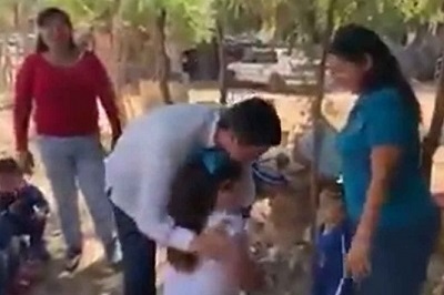 Nancy, ven para acá por favor. Qué te gusta comer… comes muchos dulces?”, pregunta el edil a la menor quien, con voz baja, responde que come huevo y le gustan los dulces.