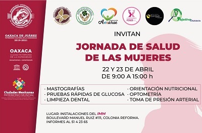 Oaxaca de Juárez, Oaxaca, a 21 de abril de 2019.- Propiciar acciones que favorezcan y contribuyan a la óptima salud en las mujeres, es prioridad para el Gobierno Municipal de Oaxaca de Juárez que encabeza el edil Oswaldo García Jarquín, por ello a través de la Dirección del Instituto Municipal de la Mujer, invita a la Jornada de Salud de las Mujeres, que se realizará los días 22 y 23 de abril.