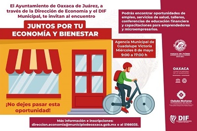 Oaxaca de Juárez, Oaxaca, a 6 de mayo de 2019.- Con la finalidad de acercar servicios de educación financiera, capacitación para el desarrollo de habilidades empresariales y fuentes de financiamiento para impulsar la productividad, el Ayuntamiento de Oaxaca de Juárez, a través de la Dirección de Economía en coordinación con el DIF Municipal, invita al encuentro “Juntos por tu economía y bienestar”, que iniciará este 8 de mayo en la Agencia de Guadalupe Victoria, a las 9:00 horas.