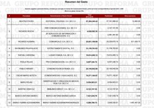 En total, los recursos entregados de 2013 a 2018 alcanzan un monto de mil 81 millones 715 mil 991 pesos por publicidad y gastos de comunicación.