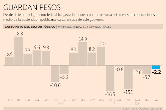 El llamado plan de austeridad de la administración actual volvió a afectar a las dependencias públicas, pues su gasto registró una reducción de 13.2%, con respecto a los primeros cinco meses del 2018. Ejercieron 418,557.5 millones de pesos.