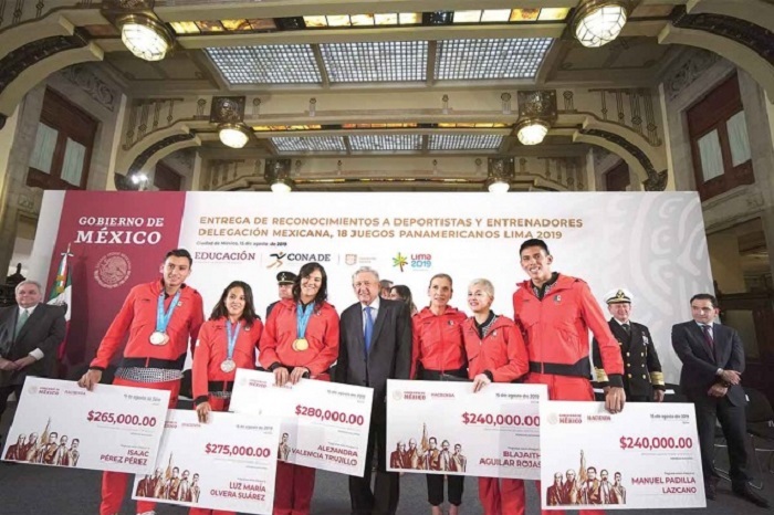 -López Obrador cumple promesa a atletas. -El Presidente entregó becas de 240 mil pesos a quienes compitieron en los Panamericanos; algunos, como el clavadista Juan Celaya, usarán el dinero para retribuir a sus familias.