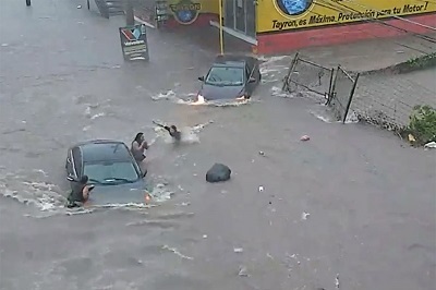 La mujer quedó atrapada en su automóvil en medio de una avenida inundada en la colonia Jorge Almada, en las imágenes de observa como intenta llegar hasta otro vehículo donde se encuentran dos personas, pero la corriente termina por vencerla.