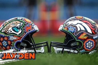 26/09/2019 09:02 Redacción|Excélsior|CIUDAD DE MÉXICO. Los Jaguares de Jacksonville y los Broncos de Denver se unieron para diseñar sus cascos con arte de la comunidad huichol, como parte de los festejos de la herencia hispana en Estados Unidos que se celebra este mes.