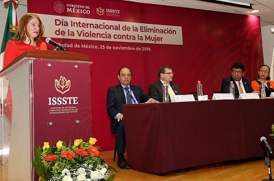 México, Ciudad de México, a 25 de noviembre de 2019. La Directora del Sistema Nacional para la Igualdad de Mujeres y Hombres del INMUJERES, María Margarita Cortés Cid, reconoció al ISSSTE como la Primer Institución del Gobierno de México en pronunciarse respecto a Cero Tolerancia al Hostigamiento Sexual y Acoso Sexual, además destacó la labor del organismo por contar con una Red de Enlaces de Género en todo el país.