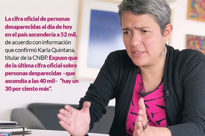 Karla Quintana Osuna, titular de la Comisión Nacional de Búsqueda (CNBP), señaló en entrevista con SinEmbargo que de la última cifra oficial sobre personas desaparecidas –que ascendía a las 40 mil – al día de hoy “hay un 30 por ciento más”. Agregó que se han dado pasos importantes en la institución, sin embargo, destaca que aún quedan muchos retos, el principal: regresar a los desaparecidos a su casa.