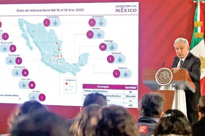 Apuntó que el huachicoleo continúa, principalmente en el estado de Hidalgo, donde en el periodo del 10 al 16 de enero se registraron 57 de las 96 tomas clandestinas del país.