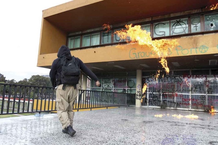 Por Frida Sánchez|Foto: Cuartoscuro |LaRazón|5 febrero, 2020 12:59 am. La marcha que jóvenes de la Universidad Nacional Autónoma de México (UNAM) convocaron para exigir a las autoridades académicas cumplimiento a su pliego petitorio, en el que incluyen acciones para frenar el acoso sexual, nuevamente terminó en vandalismo por parte de un grupo de encapuchados armados con palos, martillos y hasta bombas molotov, mismos que utilizaron para hacer pintas, romper cristales y quemar la entrada de Rectoría, con todo y que la abogada general de la casa de estudios trató de dialogar con los manifestantes, y reconoció que la universidad no ha hecho lo suficiente.