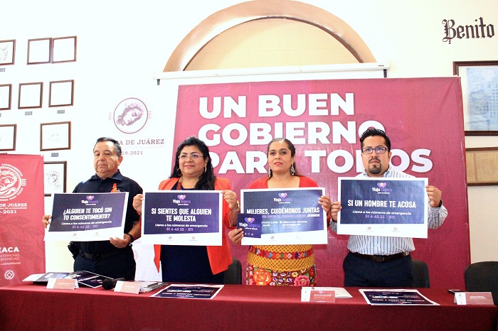 Oaxaca de Juárez, Oaxaca, a 25 de febrero del 2020.- Asumiendo el compromiso de generar políticas públicas con perspectiva de género, que permitan garantizar espacios libres de todo tipo de violencia en contra de las mujeres, el Ayuntamiento de Oaxaca de Juárez, a través de la Regiduría de Derechos Humanos y de Igualdad de Género, anunció la implementación del “Protocolo de actuación y atención en caso de violencia de género contra las mujeres, niñas y adolescentes en el servicio de transporte público”, que será acompañada de la campaña de difusión “Viaja Segura y libre de violencia”.