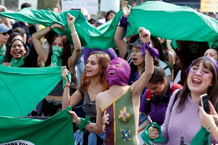 También Colombia, miles de personas, en su inmensa mayoría mujeres jóvenes, marcharon por las calles del centro de Bogotá con un marcado protagonismo del clamor por el derecho al aborto libre y seguro. Abundaban las pañoletas verdes, el símbolo que popularizó el movimiento en Argentina, y moradas, el color tradicional de las luchas feministas, entre una colorida multitud salpicada por algunas mujeres enmascaradas y otras con el pecho descubierto. En el recorrido, con evidentes ecos de la reavivada discusión sobre la interrupción voluntaria del embarazo, junto al animado ritmo de las percusiones retumbaban cánticos y lemas como “hay que abortar este sistema patriarcal”, “saquen sus rosarios de nuestros ovarios, saquen sus doctrinas de nuestras vaginas”, “que los vengan a ver, estos no son provida son solamente antimujer” o “los proveedores de aborto seguro, ¡son héroes!”.