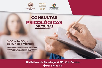 La Subdirección de Control Sanitario brinda consultas psicológicas gratuitas, en Mártires de Tacubaya número 315; interesados pueden llamar al teléfono 9515168365, de lunes a viernes de 8:00 a 14:00 horas.