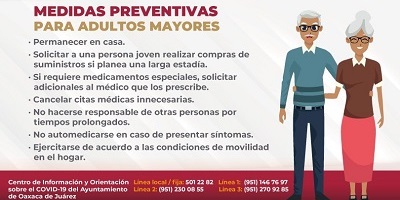 Oaxaca de Juárez, Oaxaca, 24 de marzo de 2020.- Haciendo eco a las medidas recomendadas por la Secretaría de Salud del Gobierno de México y la Organización Mundial de la Salud para evitar la propagación del COVID-19 entre la población de Oaxaca de Juárez, el Ayuntamiento pide a la población en general extremar precauciones para cuidar a los adultos mayores, el grupo más vulnerable al COVID-19, y en particular a aquellos que padecen enfermedades como diabetes, cáncer y afecciones pulmonares, entre otras.