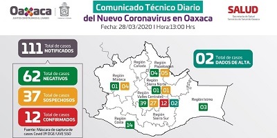 Casas Escamilla dijo que Oaxaca registra a la fecha un total de 111 notificaciones, de las cuales 12 casos son positivos, 37 sospechosos y 62 negativos. Asimismo, subrayó que la Secretaría de Salud en el estado, es la única dependencia oficial para emitir información sobre los casos.