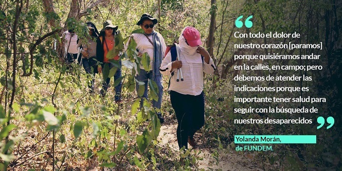 Las líderes de colectivos de desaparecidos entrevistadas aclararon con especial énfasis que el quedarse en casa no significa que “han parado”, sino que aprovecharan el repliegue obligatorio para explorar otros frentes y reforzar otras actividades, más administrativas, para reforzar la búsqueda.