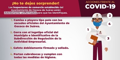 Dijo que es importante mencionar que las y los inspectores, al presentarse en un establecimiento, en todo momento deben exhibir el gafete oficial debidamente sellado y firmado, mismo que los acredita como trabajadores del Ayuntamiento de Oaxaca de Juárez. Agregó que también portan cubrebocas y cumplen con todas las medidas de higiene pertinentes en esta emergencia sanitaria.