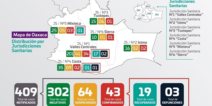 Informó que en total se han recibido 409 notificaciones -quitando el caso antes mencionado de la región del Papaloapan- de los cuales 302 son negativos y 64 casos están en proceso de estudio, 19 pacientes se han recuperado; así como tres defunciones –la última registrada este sábado de un hombre de 72 años, de la región de la Costa-.