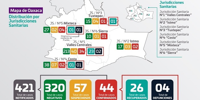 Puntualizó que del total de los contagios, la región de los Valles Centrales sigue siendo la zona más afectada con 34 casos, le siguen la Mixteca con cuatro, dos en el Istmo de Tehuantepec e igual número en la Costa, así como uno en la Sierra Norte y en Tuxtepec.