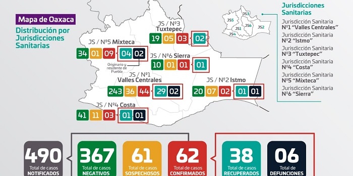 Asimismo, expresó que los 61 casos sospechosos y que se encuentran en espera de resultados por el Laboratorio Estatal de Salud Pública (LESP) Oaxaca, 36 corresponden a la zona de Valles Centrales, 11 a la Costa, siete al Istmo de Tehuantepec, cinco a Tuxtepec, uno en la Mixteca e igual número en la Sierra Norte.