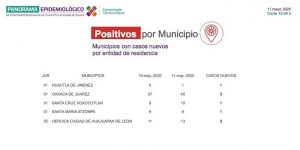 De acuerdo a los datos del área de Epidemiología los casos nuevos agregados al día de hoy, se localizan en cinco municipios: tres pacientes en Oaxaca de Juárez, dos en la Heroica Ciudad de Huajuapan de León, y uno en Huautla de Jiménez, Santa Cruz Xoxocotlán y Santa María Atzompa, respectivamente.