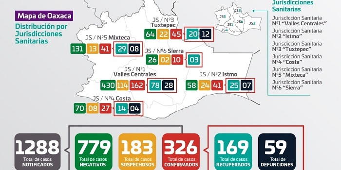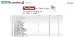 Informó que los 22 municipios con casos nuevos, son: Oaxaca de Juárez, San Antonio de la Cal, San Bartolo Coyotepec, San Francisco Telixtlahuaca, San Lorenzo Cacaotepec, San Pablo Etla, San Sebastián Tutla, Santa Cruz Xoxocotlán, Santa Lucía del Camino, Santa María Atzompa, Santa María Coyotepec, Santa María Pápalo, Tlalixtac de Cabrera.