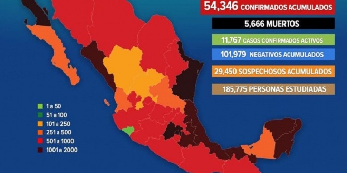 19/05/2020 19:10 REDACCIÓN|Excélsior|CIUDAD DE MÉXICO. La Secretaría de Salud federal (Ssa) informó que el número de casos confirmados de la nueva cepa de coronavirus Covid-19 aumentó a 54,346 en México.