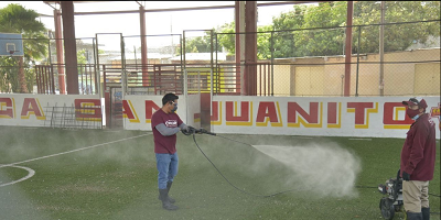 Agregó que, con la utilización de hidrolavadoras e hidrobombas cargadas con soluciones cloradas y de alcohol con agua, respectivamente, se brindó limpieza y desinfección de las áreas recreativas de básquetbol y futbol, así como la zona de juegos infantiles que se extendió hasta la Plazuela Chapultepec de dicha demarcación, así como a unidades de transporte público en la modalidad mototaxi.