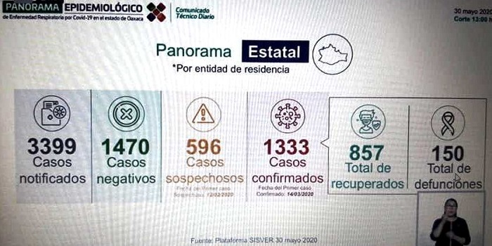 Juan López Sánchez/Barra Informativa/Oaxaca, 30 de mayo 2020.- A un día de que finalice la fase 3 de la pandemia del covid-19 en México, de la sana distancia, los contagios en Oaxaca aumentan significativamente, como hoy lo informo los Servicios de Salud locales que señalaron que fueron 82 los nuevos casos en 31 municipios, 4 de ellos de nuevo ingreso.