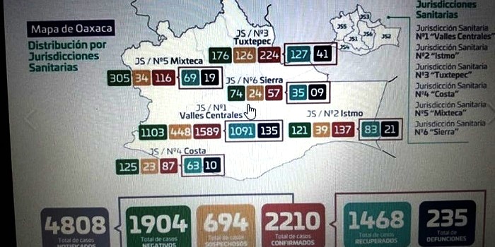 Juan López Sánchez/Barra Informativa/Oaxaca, 07 de junio 2020.- De nueva cuenta los números de contagios en esta entidad superaron los 100, ahora sumaron 118 y acumularon 2210, con 8 defunciones más para llegar a 235.