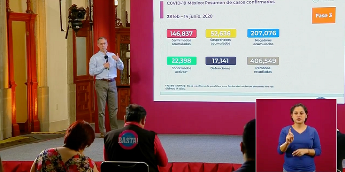 Ángeles Cruz Martínez|La Jornada | domingo, 14 jun 2020 19:41|Ciudad de México. En vísperas de que 16 entidades federativas pasen al color naranja del semáforo de riesgo Covid-19, el subsecretario de Prevención y Promoción de la Salud, Hugo López-Gatell, informó que al día de hoy se confirmaron 4 mil 147 nuevos casos de la enfermedad, con lo que el acumulado llegó a 146 mil 837.