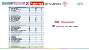 Dijo que los 124 casos nuevos se registran en 35 municipios, siendo los que mayor número presentan Oaxaca de Juárez con 55, Santa Cruz Xoxocotlán nueve, Salina Cruz cinco, San Antonio de la Cal, Santa María Huatulco, San Andrés Huayapam cuatro cada uno, el resto tres, dos y uno.