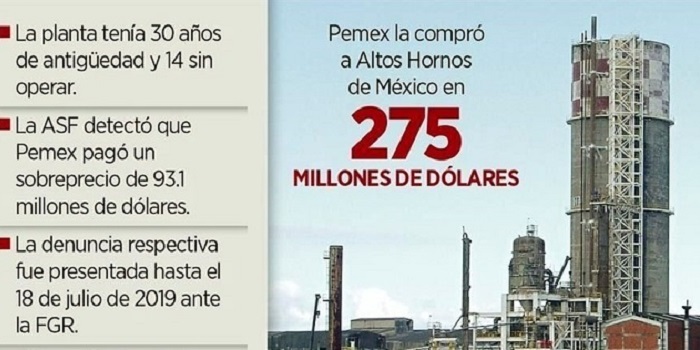 Grupo REFORMA|Cd. de México (10 agosto 2020) 05:00 hrs. El Gobierno federal quiere recuperar 200 millones de dólares que Pemex pagó en exceso a Altos Hornos de México (AHMSA) por la planta chatarra de Agronitrogenados en Veracruz, pero hasta ahora nadie está acusado de un delito específico por autorizar o participar en esa operación.