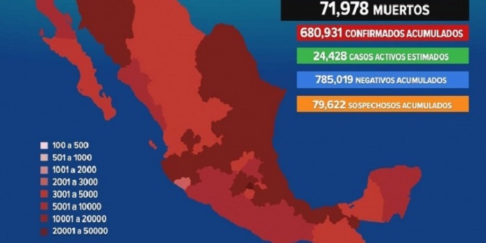 La Secretaría de Salud federal detalló que los casos confirmados acumulados de la nueva cepa de coronavirus se ubican en 680,931.