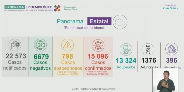 Al corte del 17 de septiembre, los SSO reportaron 2 defunciones y 66 nuevos contagios por COVID-19 con respecto al corte anterior. Suman 1,376 defunciones y 15 mil 96 casos confirmados, de acuerdo con el informe técnico, a cargo de Donato Casas Escamilla, con la representación de la Jefa del Departamento de Urgencias Epidemiológicas y Desastres, Argelia Julián Aquino, quien informó que hay 13 mil 324 pacientes recuperados del coronavirus.