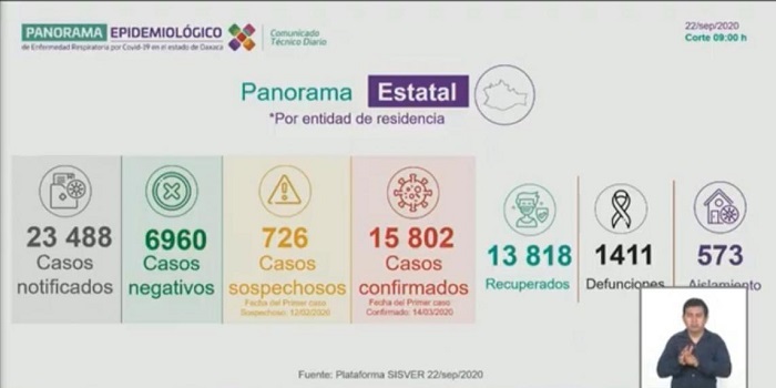 Iván Amancio Gómez|Nvinoticias|Mar, 09/22/2020 – 20:16. Al corte del 22 de septiembre, los Servicios de Salud de Oaxaca (SSO) reportaron un incremento de 16 muertes y 162 contagios por COVID-19. Con esto, las cifras estatales registran 1,411 defunciones y 15 mil 803 casos confirmados.