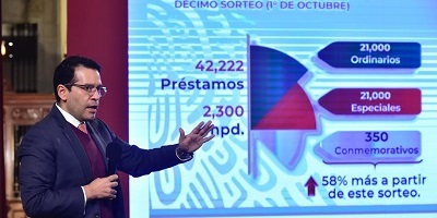 Anunció que desde el 17 de septiembre iniciaron las inscripciones para el décimo Sorteo Electrónico que se llevará a cabo el próximo 1° de octubre, en el que se ofertarán préstamos personales por 2 mil 300 millones de pesos en tres modalidades: 21 mil ordinarios –otorgan de 25 mil a 60 mil pesos-, 21 mil especiales -ofrecen de 60 mil a 120 mil pesos-, y 350 conmemorativos -dan de 80 mil a 190 mil pesos.