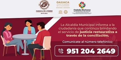 Oaxaca de Juárez, Oaxaca, a 12 de octubre de 2020.- Con el firme compromiso de continuar atendiendo las peticiones y solicitudes de la ciudadanía durante la contingencia sanitaria a causa del COVID-19, el Ayuntamiento de Oaxaca de Juárez, a través del Juzgado Contencioso Administrativo de la Alcaldía Municipal, continúa brindando el servicio de justicia restaurativa mediante la conciliación, atendiendo de manera gratuita las solicitudes ciudadanas.
