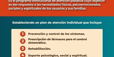 López Elizalde puntualizó que los equipos de profesionales que participan en este programa se enfocan en el control del dolor y otros síntomas físicos además del acompañamiento de las necesidades psicológicas, emocionales, familiares, sociales e incluso espirituales de los pacientes y brinda también apoyo a los familiares.