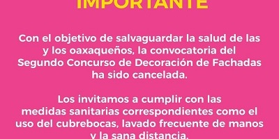 La Seculta, indicó que aún cuando en tiempo y forma, se tramitó y obtuvo la autorización de las autoridades del municipio de Oaxaca de Juárez a través de la Dirección del Centro Histórico, debido al eventual cambio del semáforo epidemiológico que emiten las autoridades sanitarias estatales, no se llevará a cabo el Concurso de Fachadas.