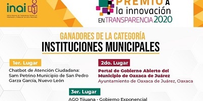 Oaxaca de Juárez, Oaxaca, a 20 de octubre de 2020.- El Ayuntamiento de Oaxaca de Juárez que encabeza el Presidente Municipal, Oswaldo García Jarquín, continúa sumando reconocimientos por mantener un Gobierno Abierto, transparente y con buenas prácticas para facilitar a la ciudadanía el acceso a la información pública. En esta ocasión, el gobierno municipal obtuvo el segundo lugar del “Premio a la Innovación en Transparencia 2020”, en la categoría Instituciones Municipales, convocado por el Instituto Nacional de Transparencia, Acceso a la Información y Protección de Datos Personales (INAI) y la Auditoría Superior de la Federación (ASF).