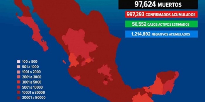 México alcanzó los 97 mil 624 fallecidos por la pandemia de Covid-19; la Ciudad de México se mantiene en semáforo naranja con alerta por lo que se implementarán medidas para disminuir los contagios.