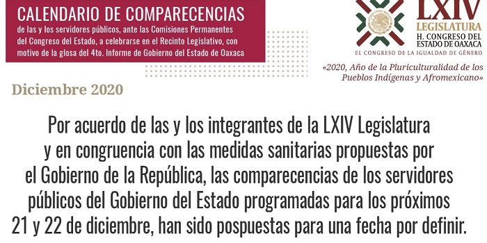 San Raymundo Jalpan Oax. 18 de diciembre de 2020.- Mediante el acuerdo de las y los diputados del Congreso Local se determinó aplazar las comparecencias de los titulares de la Secretaría de Salud de Oaxaca (SSO), y del Instituto Estatal de Educación Pública de Oaxaca (IEEPO), programadas para los días 21 y 22 de este mes.
