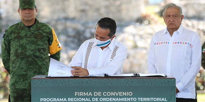 Por: LA RAZÓN ONLINE |20/12/2020 22:28. El gobernador de Quintana Roo, Carlos Joaquín González, firmó con el presidente Andrés Manuel López Obrador el Convenio del Programa de Ordenamiento Territorial del Sureste, que tiene como objetivo poner orden, que no haya anarquía, que no haya caos, que se puedan definir los planes de desarrollo urbano en esta región del país.