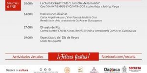 El próximo 6 de enero a las 10:00 horas se transmitirá la lectura dramatizada “La noche de la ilusión” por Lucina Rojas y Rodrigo Vargas; a las 14:00 horas se transmitirá el proyecto “Narraciones diluidas” de Carlos Angelino Lucas y Ever Pascual Bautista Cruz, ganadores de la convocatoria CurArte es Guelaguetza.