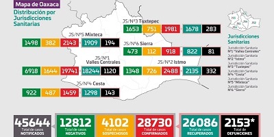 Informó que la jurisdicción sanitaria número uno Valles Centrales, contabiliza 19 mil 741 casos confirmados y mil 120 defunciones; el Istmo dos mil 488 y 332 defunciones; la Mixteca dos mil 143 y 194 defunciones; Tuxtepec mil 981 y 283 defunciones; Costa mil 459 y 143 defunciones, y la Jurisdicción de la Sierra 918 y 81 defunciones.