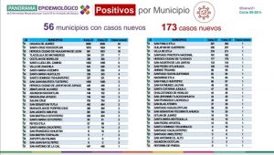 Mencionó que los 173 casos nuevos de COVID-19 se registran en 56 municipios, siendo el de Oaxaca de Juárez el que mayor número presenta con 44, seguido de Santa Cruz Xoxocotlán con 14, Huajuapan de León con 10, Tlacolula de Matamoros y Ocotlán de Morelos siete cada uno, Santa Lucía del Camino seis, Villa de Zaachila cinco, el resto cuatro, tres, dos y un caso.