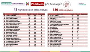 Los 130 casos nuevos se ubican en 43 municipios, dentro de los que destacan por el mayor número: Oaxaca de Juárez con 48 y San Juan Bautista Tuxtepec, Santa María Atzompa, así como Santa María Huatulco con seis, respectivamente, el resto cuatro, tres, dos y uno.