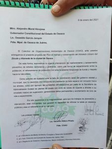 Redacción|Barra Informativa| Oaxaca 10 de enero 2021. Ante las reforestaciones sin planeación por parte de las autoridades, el Colectivo de Organizaciones Ambientales de Oaxaca (COAO), representado por Gerardo Aldeco Pinelo e integrantes de la sociedad civil Arnoldo Dámaso, José Luis Fierro García, Manuel Chávez, Nazario García y el secretario del Comité del Árbol del Tule, Abel Ramírez, el pasado viernes, presentaron y entregaron el proyecto del Plan de manejo y conservación del arbolado urbano del Zócalo y Alameda de la ciudad de Oaxaca de Juárez al Gobierno del Estado de Oaxaca.