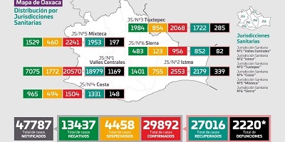 Refirió que la Jurisdicción Sanitaria número uno Valles Centrales contabiliza 20 mil 570 casos confirmados y mil 169 defunciones; Istmo dos mil 553 y 339 fallecimientos; Mixteca dos mil 241 y 197 decesos; Tuxtepec dos mil 068 y 285 muertes; Costa mil 504 y 148 defunciones; y Sierra 956 y 82 defunciones.