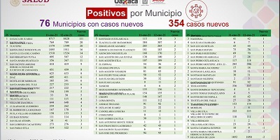 En cuanto a los municipios que reportaron nuevos contagios, dijo que en primer lugar se encuentra Oaxaca de Juárez con 111 casos, Salina Cruz y San Juan Bautista Tuxtepec ambos con 20, Santa Cruz Xoxocotlán con 16, Santa Lucía del Camino con 14, San Sebastián Tutla con 12 y Santa María Huatulco con 11, por mencionar algunos.